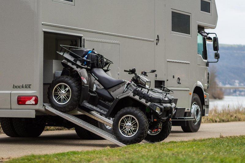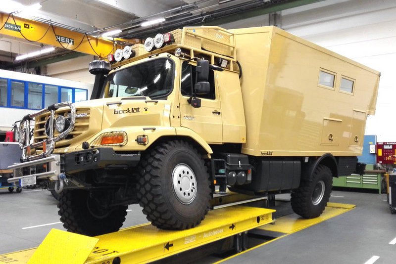 Furthermore, we equip the vehicles with additional fuel tanks, reconstruct the driver cab and assemble storage boxes and steps. Many systems, such as our well-known automatic entry steps, various roof racks as well as rear carriers for bikes or motorcycles, are bocklet in-house developments.