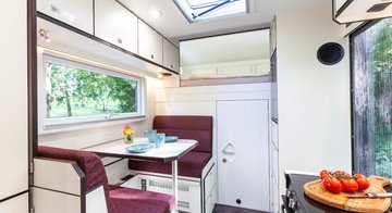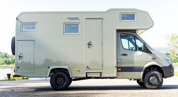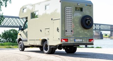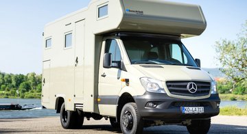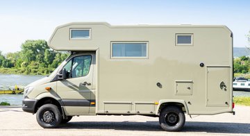 Kurz und kompakt zeigt sich dieses Alkvoenreisemobil auf Basis Mercedes Sprinter. Der werksseitige, zuschaltbare Allradantrieb mit Untersetzungsgetriebe sorgt für ausreichend Vortrieb. Im Innenraum wird das hinterere, quer im Fahrzeug angeordnete Heckbett durch das davorliegende Raumbad vom vorderen Wohraum abgetrennt.