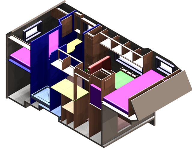 - Kabinenstirnwand in 50mm GFK-Sandwichbauweise mit verschließbarer Durchgangstür