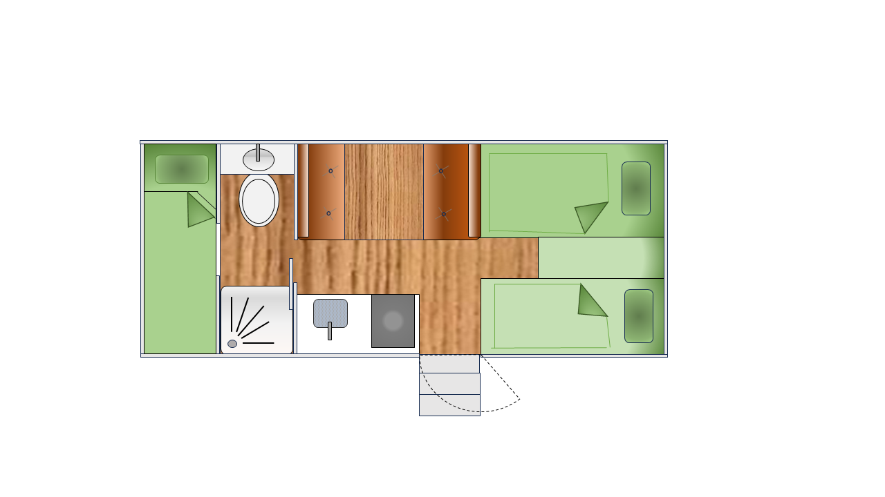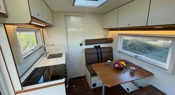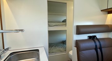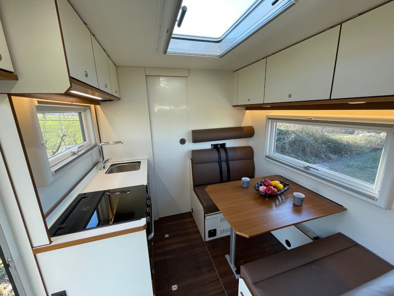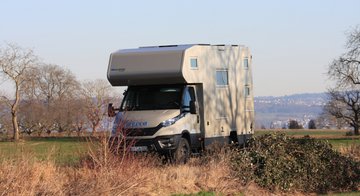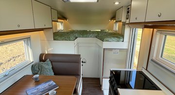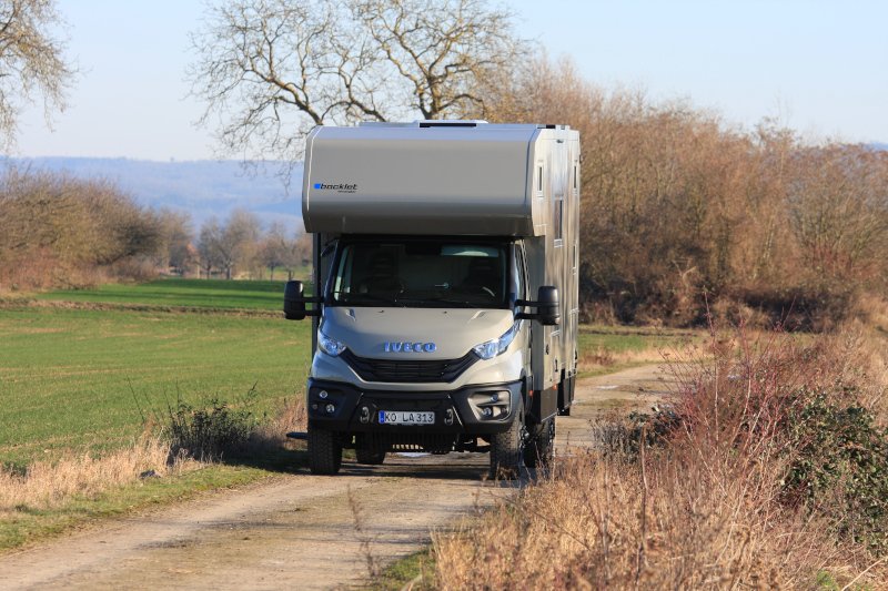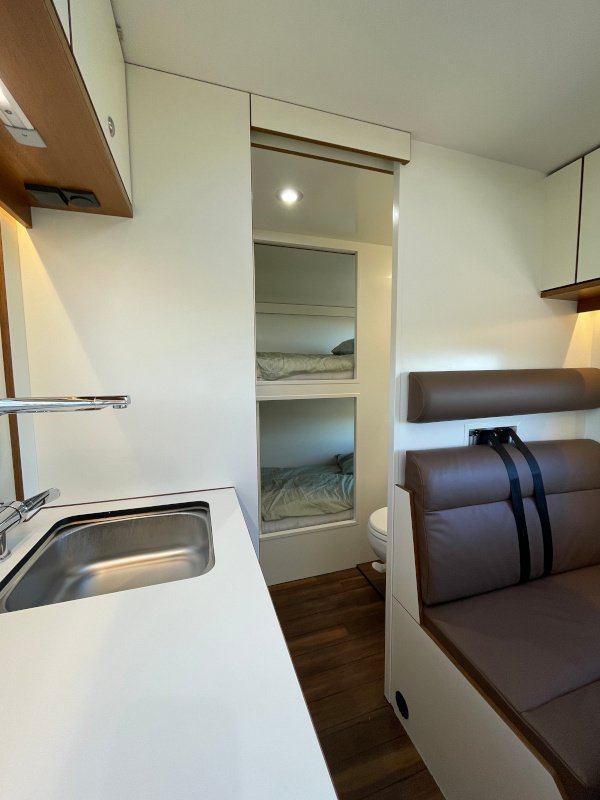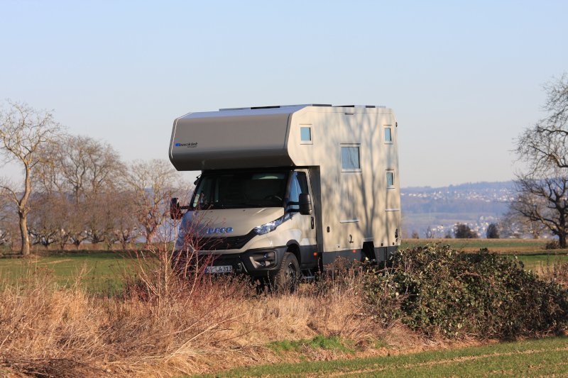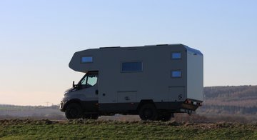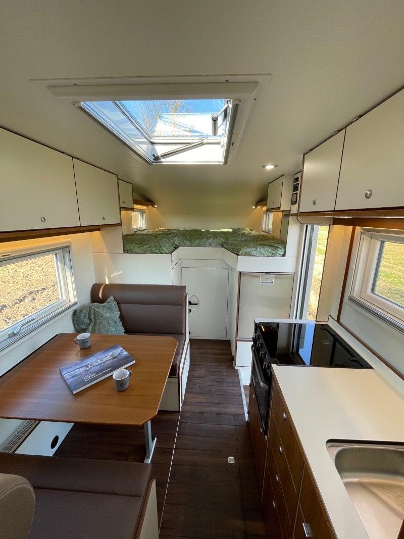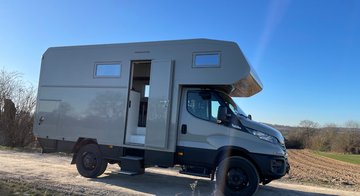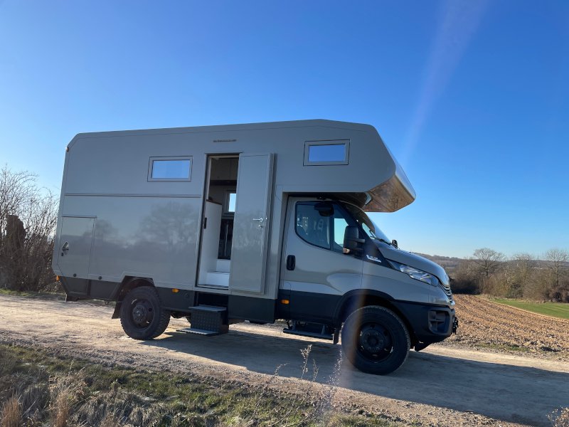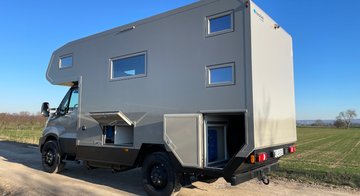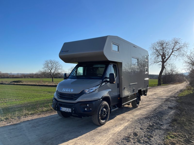 Das kompakte Fahrzeug mit Allrad-Fahrwerk verbindet in diesem multifunktionell einsatzfähigem Aufbau die Vorteile eines klassischen Alkoven-Reisemobil mit der Vielseitigkeit eines Offroaders. Das Platzangebot ist optimal ausgenutzt. Die Betten im Alkoven und das Etagenbett im Heck bieten für 4 Personen ausreichend Platz. Unter dem überkragenden Alkovenbett ist ein Schrank und der Kühlschrank eingebaut. Der abgetrennter Stauraum im Heck, ein optimal geplanter Doppelboden im Wohnraumbereich sowie Hängeschränke schaffen den Raum für alles Notwendige einer langen Reise. Die hochwertige Innenausstattung in Bad und Küche genügt auch den höchsten Ansprüchen der Reisenden.