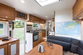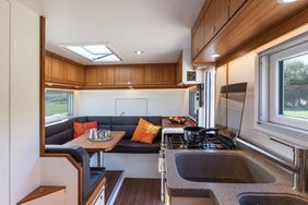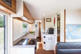 Prägend für das von uns umgesetzte Grundrisskonzept sind der vordere, großzügige Wohnbereich mit Sitzgruppe, Küche und Bad. Im hinteren Teil des Aufbaus findet sich der zweite, durch eine Tür abtrennbare Raum mit Bett, Dusche und optionalem Arbeitsplatz. Wir finden ein tolles Layout für Langzeitreisen.