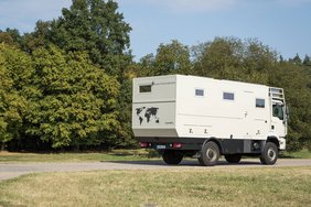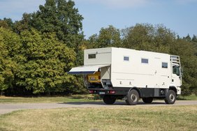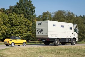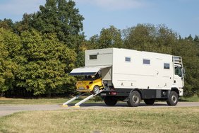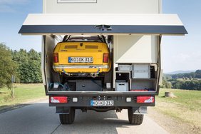 So schmiegt sich das quietschgelbe Fiat Cabrio eng in seine Maß-Garage in dem gerade einmal 8m langen Bocklet Fernreisemobil auf MAN Basis. Mit wenigen Handgriffen über einen Windeneinzug zu verladen steht es schnell für eine erlebnisreiche Ausfahrt zur Verfügung.